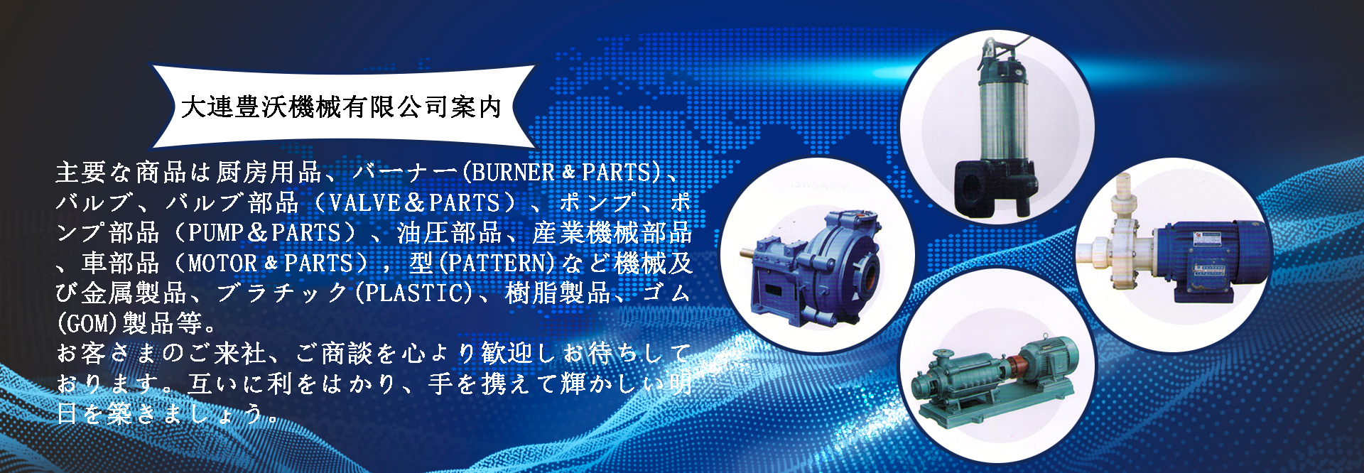 大連豊沃機械有限公司は國際貿易を主にして 専門商社でおり、子會社の機械加工工場を1社持ち、業務提攜パトーナが數社あります。國際貿易を従事して十年以上、メインは日本向けですが、アメリカ、ューロパ市場向けも少しあります。砂鋳造(CASTING)(FC,FCD,FACD,ADI)、ロストワックス(LOST-WAX)、鋳鋼(SC,SCS)、ステンレス(SUS)、ダイカスト(DIE-CASTING)(アルミ、真鍮)、鍛造(FORGING)、プレス(PRESS)、製缶(WELDING)など幅多く分野ております。主要な商品は廚房用品、バーナー(BURNER﹠PARTS)、バルブ、バルブ部品(VALVE&PARTS)、ポンプ、ポンプ部品(PUMP&PARTS)、油圧部品、産業機械部品、車部品(MOTOR﹠PARTS),型(PATTERN)など機械及び金屬製品、ブラチック(PLASTIC)、樹脂製品、ゴム(GOM)製品等。